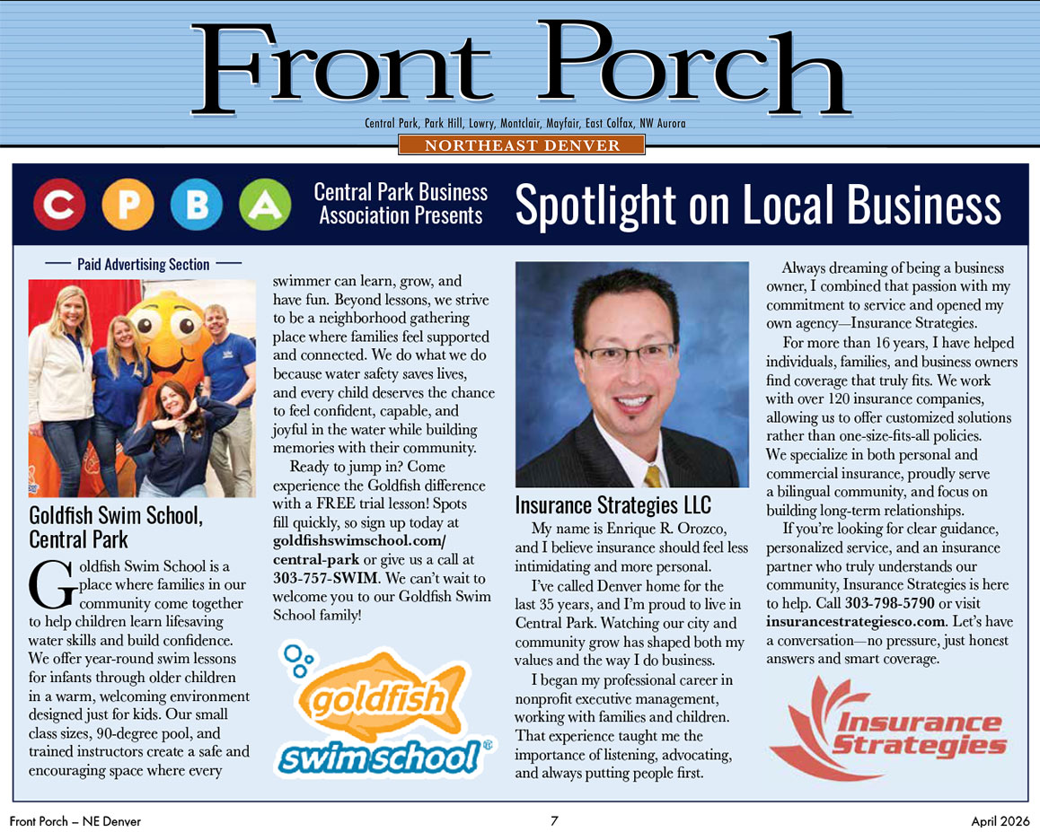 Get your business featured in a “Spotlight on Local Business” featurette in Front Porch newspaper! Distribution is to 25,000 homes in northeast Denver including Central Park, Park Hill, Lowry, Mayfair, Montclair, East Colfax, and more.